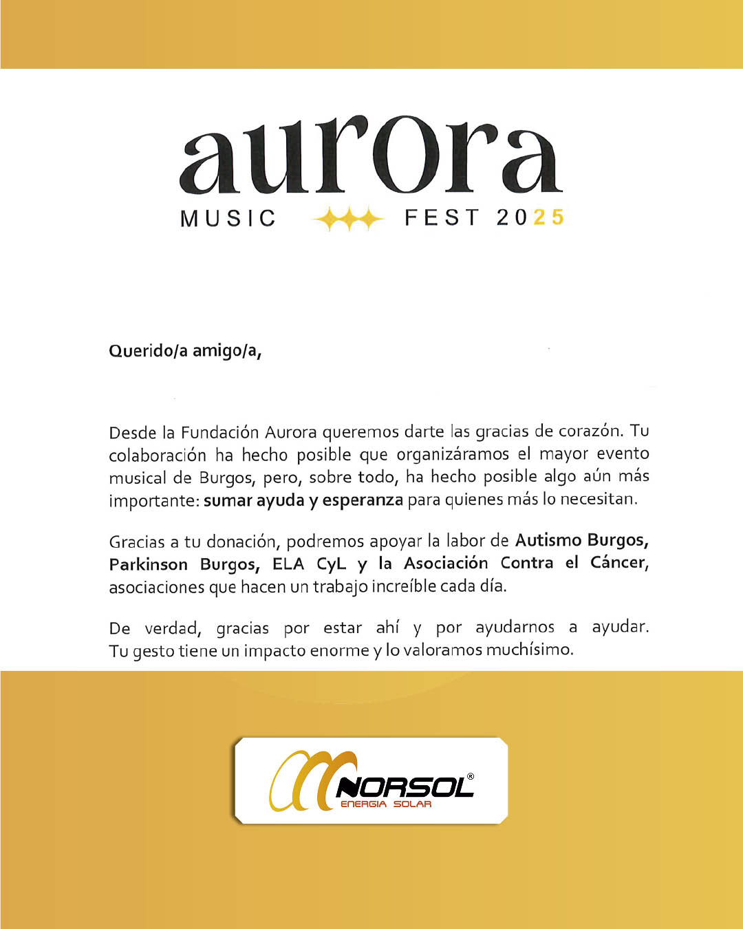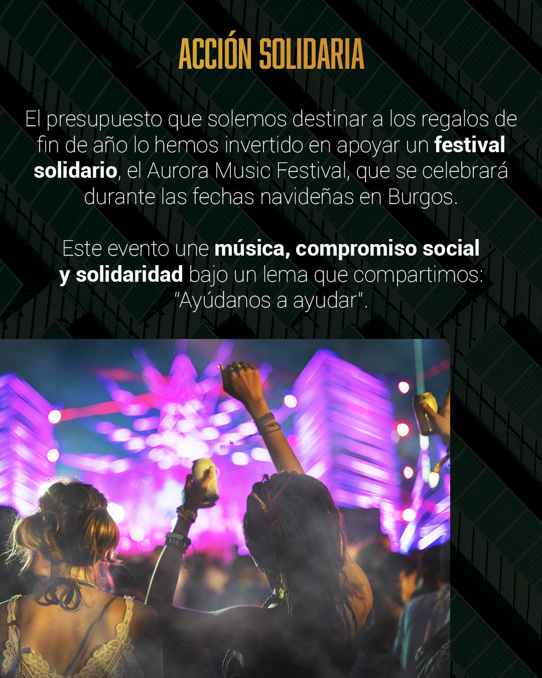 Este año, sin embargo, hemos decidido ir un paso más allá y convertir ese gesto en algo que tenga un impacto real en nuestra ciudad. Por eso, el presupuesto que solemos destinar a los regalos de fin de año lo hemos invertido en apoyar un festival solidario, el Aurora Music Festival, que se celebrará durante las fechas navideñas en Burgos. Este evento une música, compromiso social y solidaridad bajo un lema que compartimos: “Ayúdanos a ayudar”.